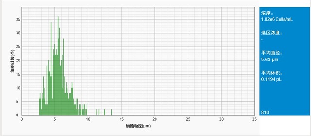 庫爾特粒徑分辨率0.5μm,通過細胞大小分布情況判定轉染前細胞狀態(tài),并能通過圖像檢測模塊進行臺盼藍染色活性判斷,歷史數(shù)據的統(tǒng)計和導出能夠跟蹤細胞生長情況。