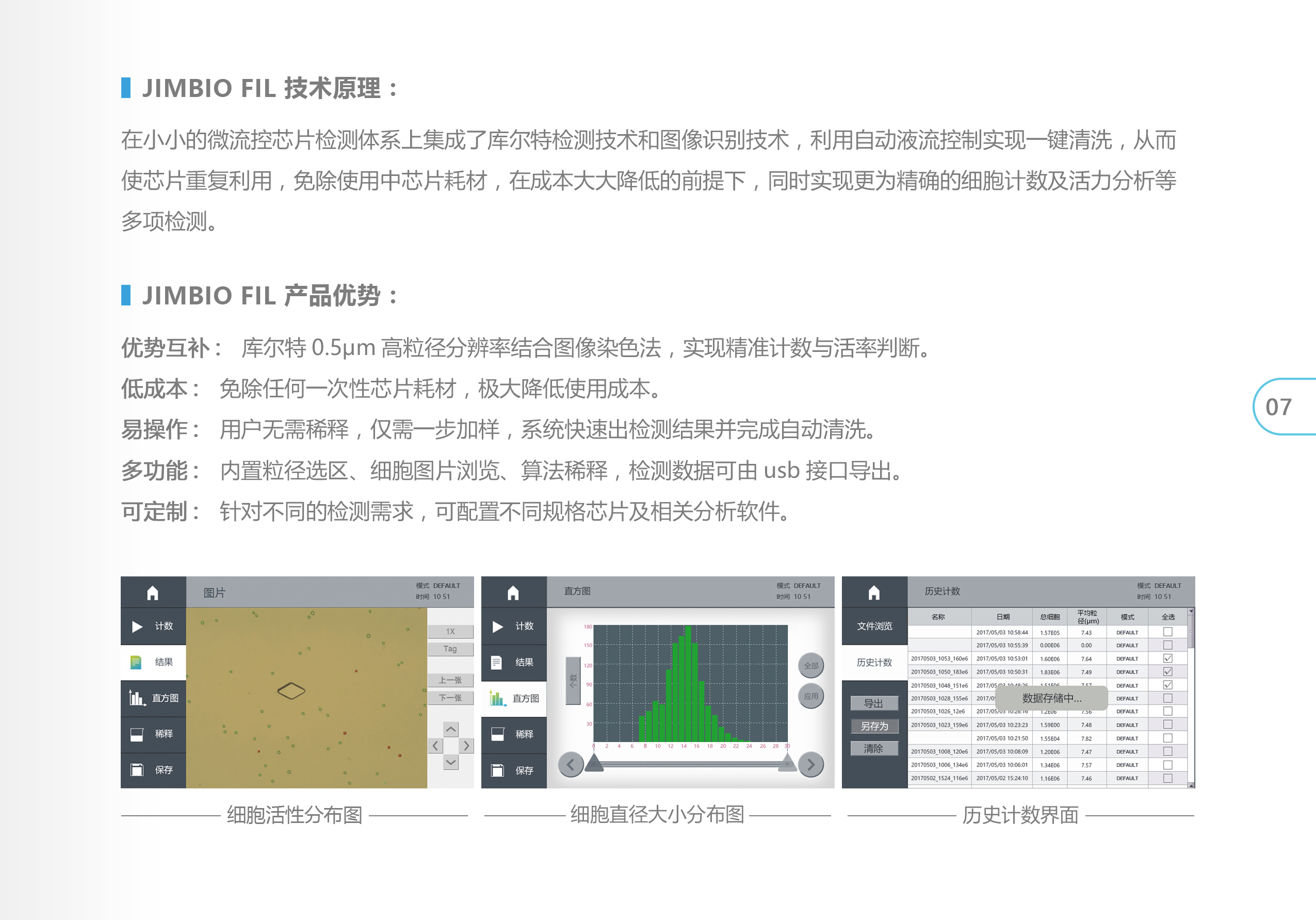 Jimbio FIL結合了流式庫爾特原理和圖像法,庫爾特0.5μm高粒徑分辨率結合圖像染色法,實現(xiàn)精準計數(shù)與細胞活率判斷。