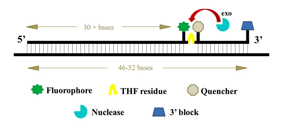 本試劑盒基于一種常溫恒溫核酸快速擴(kuò)增技術(shù):在常溫恒溫下,特殊修飾的反轉(zhuǎn)錄酶利用特異性引物和模板RNA合成cDNA鏈,反應(yīng)體系中的重組酶、單鏈DNA結(jié)合蛋白和DNA聚合酶以新合成的cDNA鏈為模板進(jìn)行快速核酸擴(kuò)增反應(yīng)。依賴nfo酶的作用,加入根據(jù)模版設(shè)計(jì)的特異的分子探針,使用膠體金技術(shù)(三明治夾心法)可以對最終結(jié)果進(jìn)行檢測。3. THF 距離 3’末端約 15 nt,并且 3’末端標(biāo)記一個(gè)修飾基團(tuán),例如胺基、磷酸基團(tuán)或 C3-spacer。