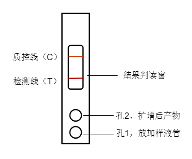 陽性結(jié)果表明樣本中含有待檢測的核酸片段,且其數(shù)量≥檢測卡的最低檢出量。當目的核酸產(chǎn)物濃度較低時,試紙條C線顯色呈紅色,T線呈淡紅色,甚至淺粉色條帶,該結(jié)果也應(yīng)判定為陽性。當目的核酸產(chǎn)物濃度較高時,試紙條C線顯色呈紅色,T線呈紅色,該結(jié)果也應(yīng)判定為陽性。