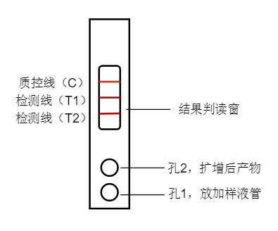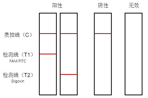 檢測(cè)卡出現(xiàn)質(zhì)控線(C)和檢測(cè)線(T2),都是紅色條帶,則靶標(biāo)2為陽(yáng)性;