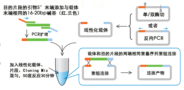 一步法無縫克隆試劑盒不依賴于T4連接酶,不受載體和目的片段的酶切位點(diǎn)限制,而直接用重疊片段重組的方法,采用特殊的酶組合可以將任意方法線性化后的載體和與其兩端具有16-25bp重疊區(qū)域的PCR片段定向重組連接,可以30分鐘內(nèi)實(shí)現(xiàn)A末端或者平末端PCR產(chǎn)物片段高效定向無縫克隆至載體的任意位點(diǎn)。