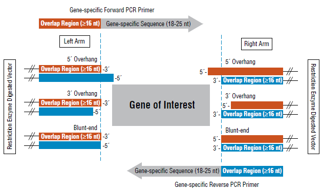 注意:重疊區(qū)的堿基數(shù)至少16 bp,并且Tm值需要﹥48°C (AT pair = 2°C and GC pair = 4°C),否則可延長堿基數(shù)目直到符合要求。