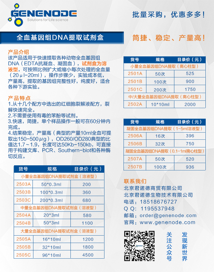 5.溶液型全血基因組DNA提取方法,可以很容易的按照比例擴(kuò)大或者縮小每次處理的全血量(20μl-10ml),需要具體產(chǎn)品操作說明,請聯(lián)系我們索取不同處理量的操作說明書。